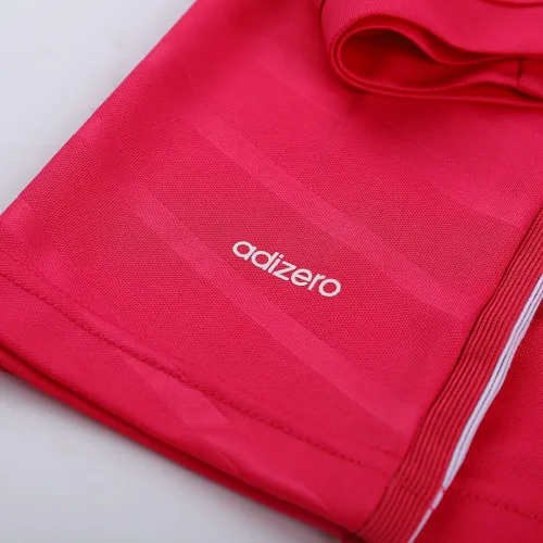 The pink kit comes with white applications like white Adidas stripes, white Adidas logo and some white details.