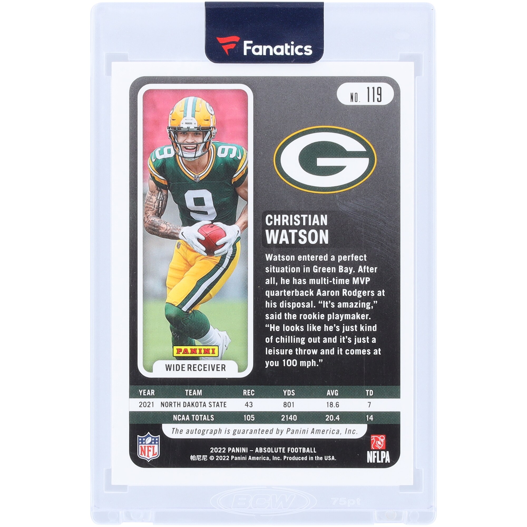Grab this Christian Watson Green Bay Packers Autographed 2022 Panini Absolute Gold Spectrum Autograph #119 #/10 Rookie Card to