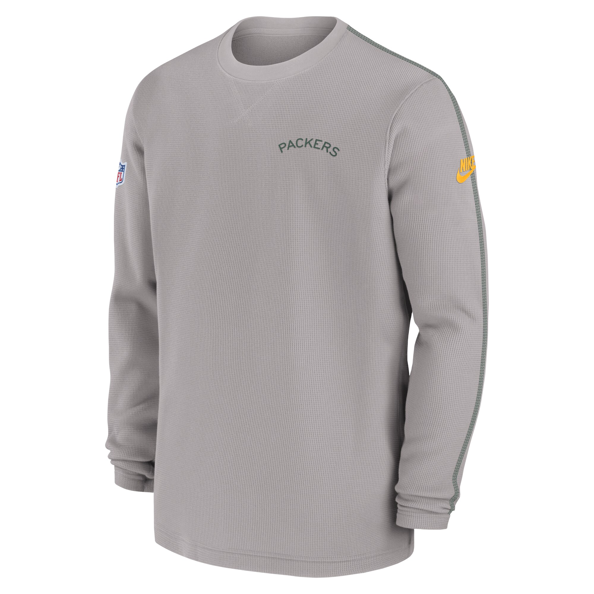 features a throwback Green Bay Packers logo embroidered on the front and contrast-color stitching down the sleeves. Waffle-weave