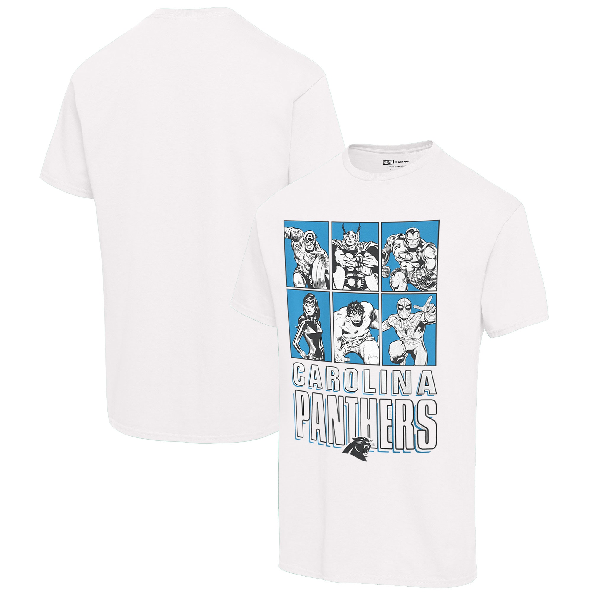 Unisex Junk Food White Carolina Panthers Disney Marvel Avengers Line-Up T-Shirt