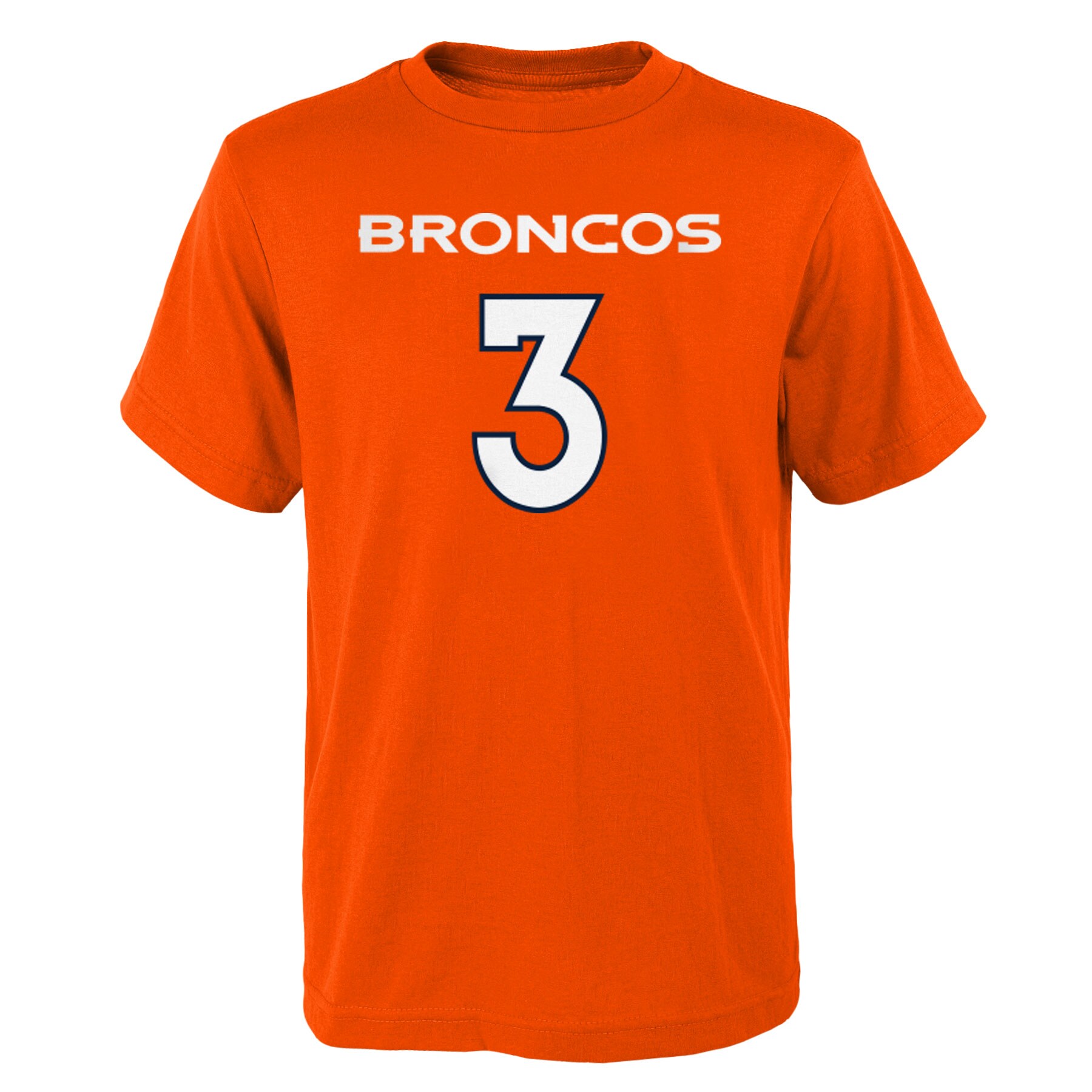 Broncos Mainliner Player Name & Number T-Shirt. It features bold team and Russell Wilson graphics, so no one will be able to